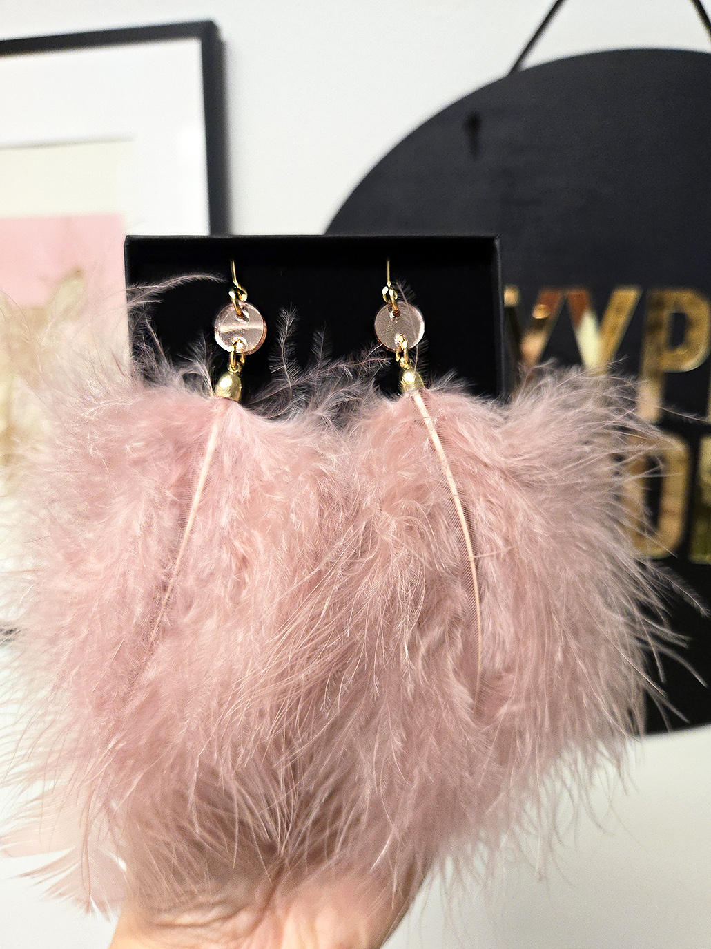 Höyhen on istutettu kullanväriseen holkkiin ja ylhäällä on ruusukullan värinen peiliakryyliosa. Korviksissa on kullanväriset metalliosat ja koukkukiinnitys.