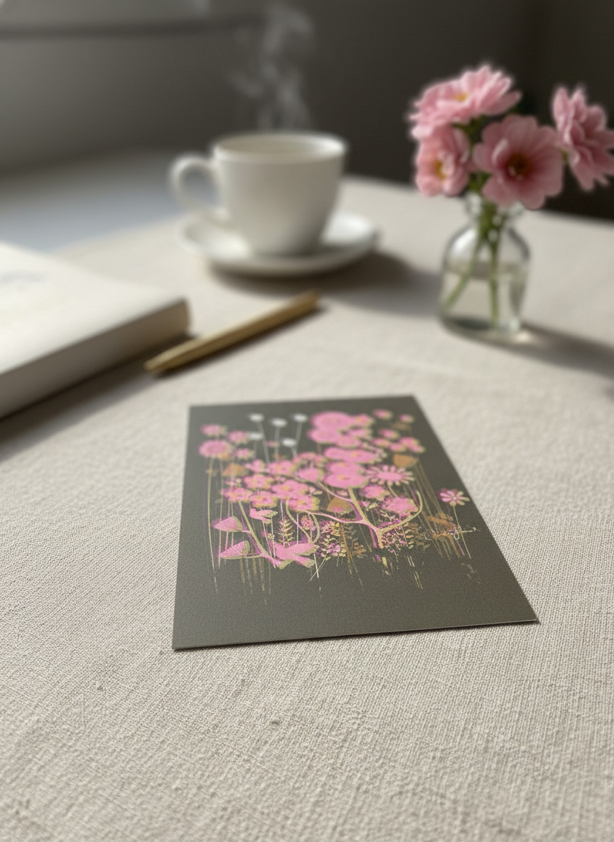 Kaunis A6-kokoinen postikortti, jossa kedon kukkia vaaleanpunaisina tummanvihreällä taustalla.
