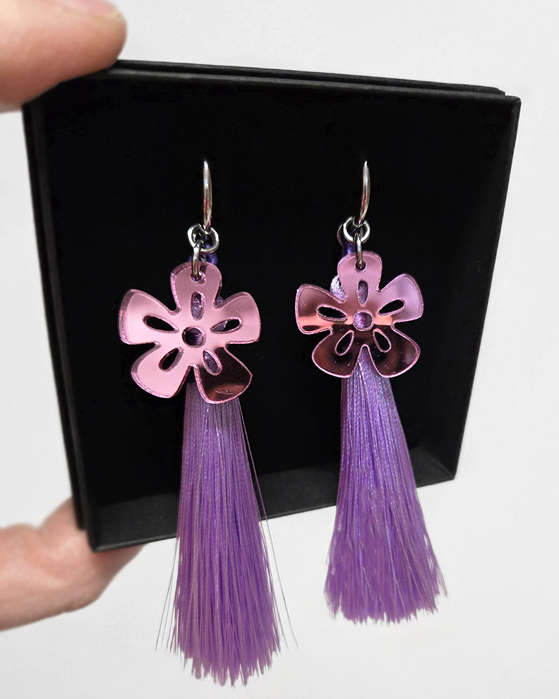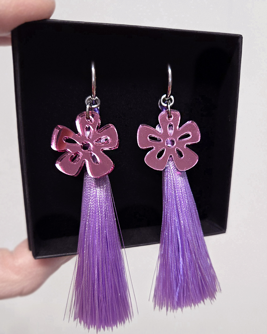 Kimaltelevasta peiliakryylistä valmistettu kukka ja sen takana runsas, polyesterilangasta solmittu laventelinvärinen tupsu roikkuvat teräksenvärisessä korvarenkaassa, josta molemmat saa halutessaan myös irti: sekä kukkaa että tupsua voi käyttää renkaassa myös yksinään tai lisättyä esim. kaulaketjuun riipukseksi!